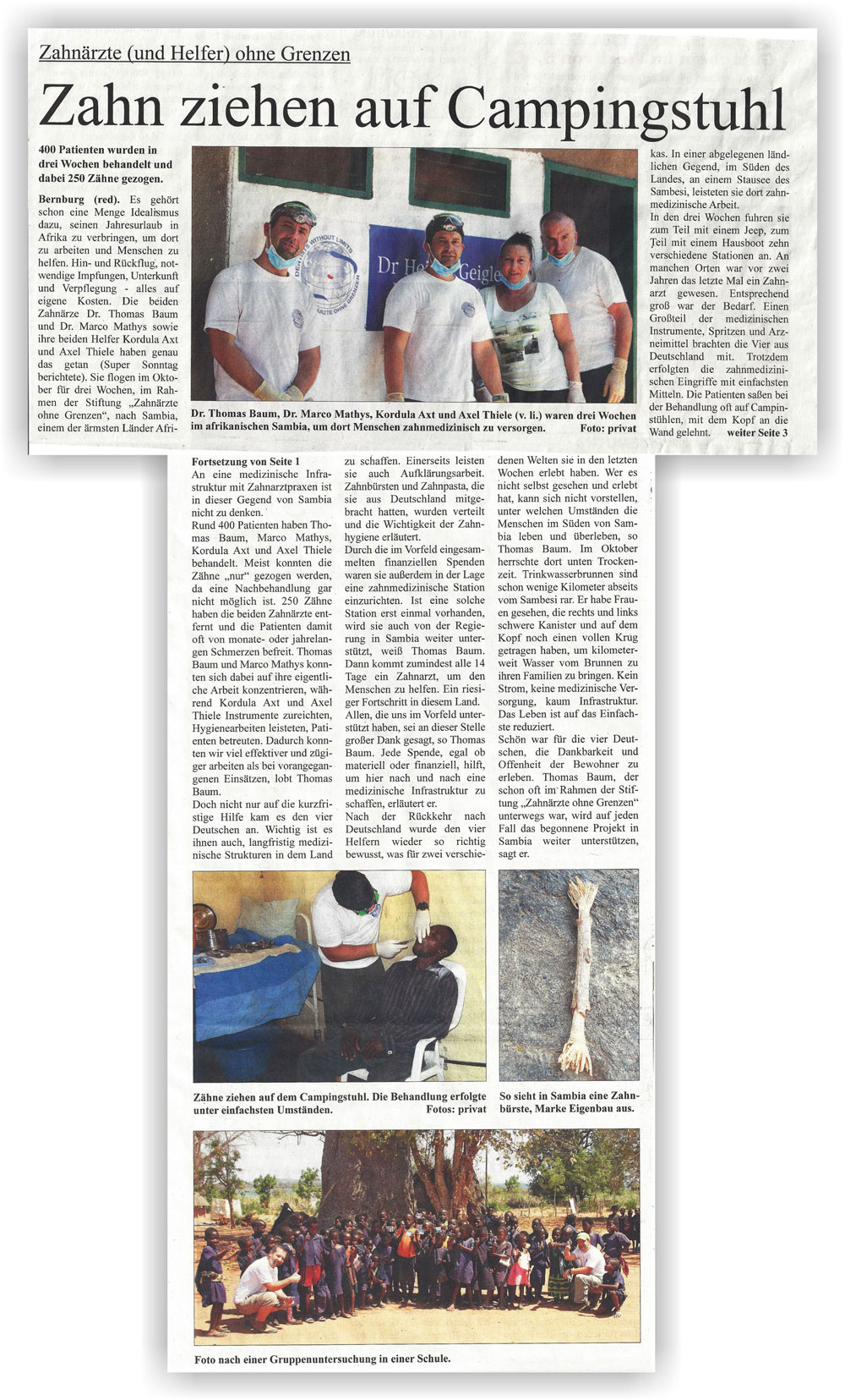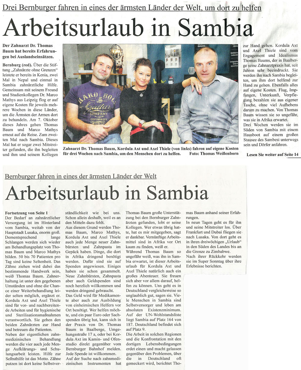 Im Oktober 2014 zogen die „Zahnärzte ohne Grenzen“ Dr. Mathys und Dr. Baum erneut aus, um in der Welt ein paar benachteiligten Menschen eine sonst schwer mögliche Zahnbehandlung zu ermöglichen und vorhandene Strukturen zu stützen und zu stabilisieren. Nach 2012 hieß das Ziel wiederum Sambia.